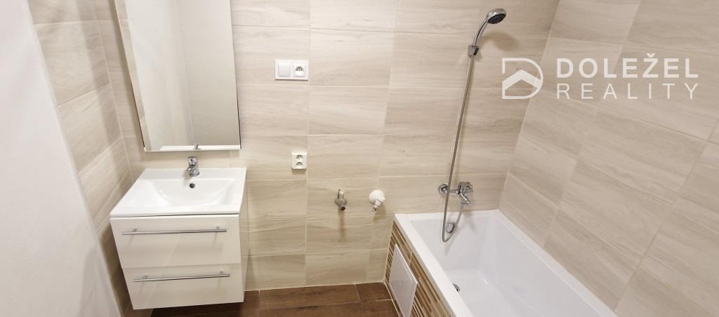 Pôvodné umakartové jadro je kombinované so sadrokartónom. V zrekonštruovanej dispozične zväčšenej kúpeľni je nová dlažba s obkladačkami, znížený strop, ventilátor, vaňa, umývadlo so skrinkou a zrkadlom ako aj priestor pre práčku. Toaleta je samostatná.