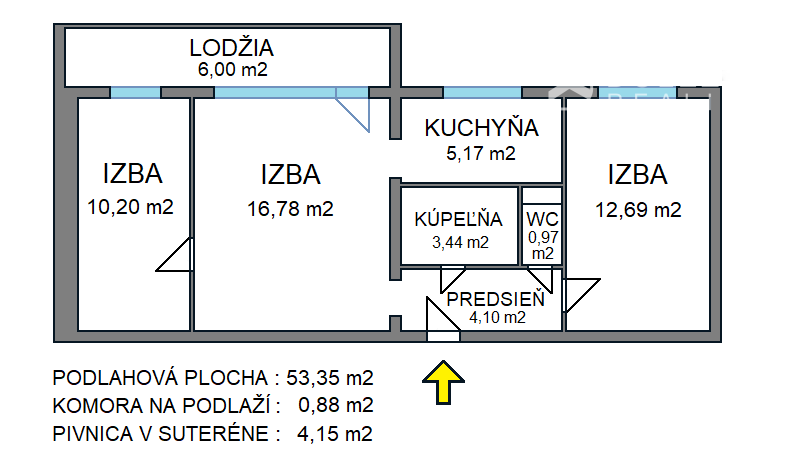 Podlahová plocha bytu je 54 m2 vrátane príručného kumbálu na vonkajšej chodbe. K bytu patrí veľká pivnica v suteréne domu o rozlohe 4 m2.