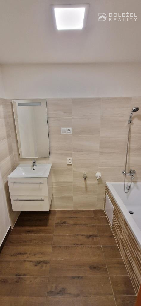 Pôvodné umakartové jadro je kombinované so sadrokartónom. V zrekonštruovanej dispozične zväčšenej kúpeľni je nová dlažba s obkladačkami, znížený strop, ventilátor, vaňa, umývadlo so skrinkou a zrkadlom ako aj priestor pre práčku. Toaleta je samostatná.