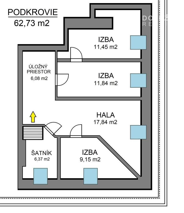 Zo vstupnej chodby v byte je cez otvor v strope prístup do odkúpeného podkrovného priestoru nad bytom. Podľa pôvodnej projektovej dokumentácie a stavebného povolenia sa má priestor v podkroví s mezonetovou vstavbou o výmere 62,73 m2 dispozične deliť na drevené schodisko, halu, tri izby, šatník a úložný priestor, s napojením na jestvujúcu elektroinštaláciu, vodoinštaláciu a vykurovanie uvedeného bytu. Strecha je škridlová, presvetlenie priestoru je riešené piatimi osadenými strešnými oknami značky Velux.